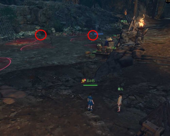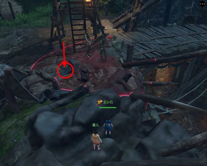 6、继续走,鼠标放在大石头后面的这个位置,使用石头可以吸引这两个守卫。