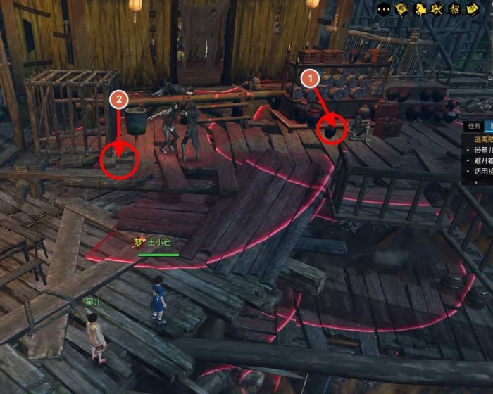 5、继续走,先用石头打碎酒坛,然后鼠标放在2号点的位置上,使用石头可以吸引这两个守卫。