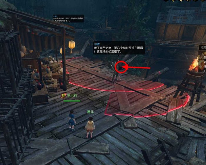 4、继续走,选中酒坛,用石头打碎可以吸引两个守卫。随后继续前进。