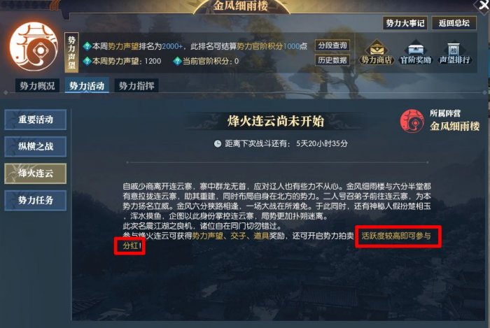 每周六晚上9点开启烽火连云,结束后会开启公共拍卖。拍卖所得会根据玩家的活跃情况进行分红。(活动限制进入人数,需活跃玩家以及势力贡献较为突出才可参与,同时挂机是没有奖励的)