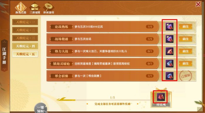 在右上角手册中可查看扬名之路。完成5大天极纪元任务(共25个小任务)均可获得铜钱奖励。全部完成可获得19万2千的铜钱奖励。