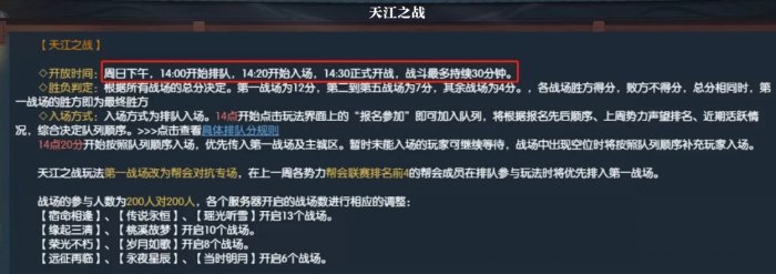 每周日下午2点开启天江城的争夺,同样是结束后会开启公共拍卖。拍卖所得会根据玩家的活跃情况进行分红。(活动限制进入人数,需活跃玩家以及势力贡献较为突出才可参与,同时挂机是没有奖励的)