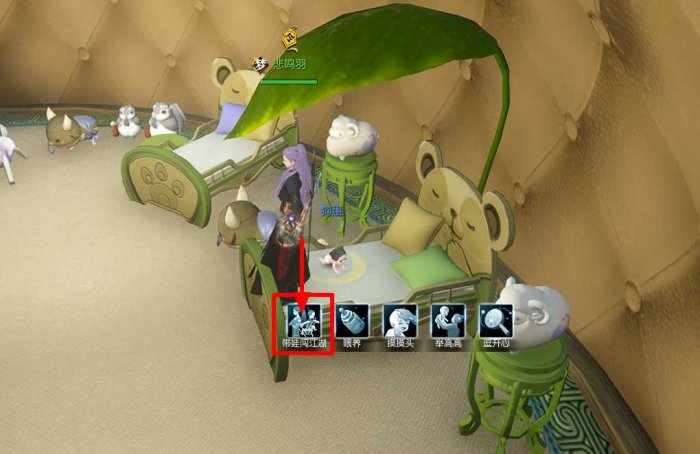 ②进入嬉游园,鼠标点击宝宝会有5个互动按键。如果有每日任务,一定要最后完成【带娃闯江湖】,选择这个后,宝宝会有20分钟无法互动。