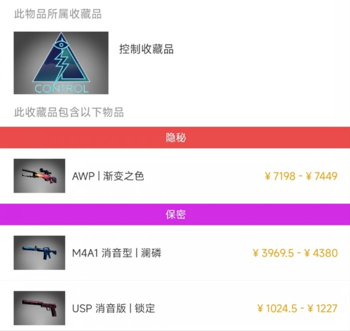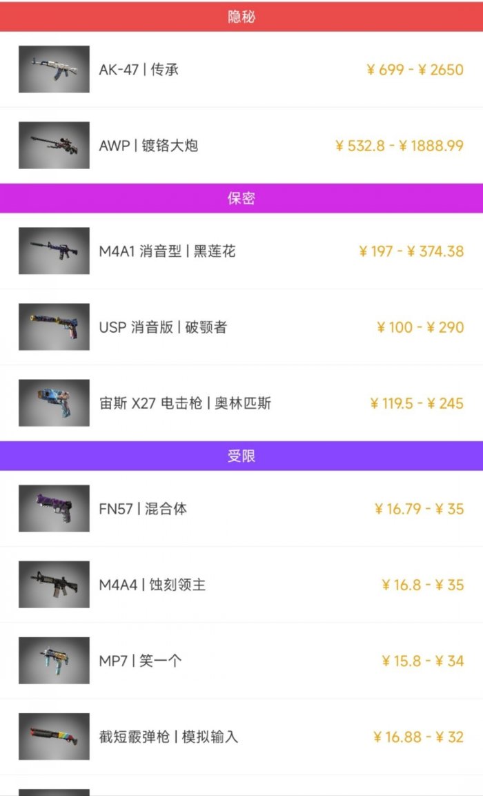 首先解释一下上级这个名词,在cs中是指材料所对应的武器箱中 比材料高一级的饰品,以下图千瓦武器箱为例五把受限级藏品(紫)所对应的上级就是三把保密级藏品(粉),三把保密级藏品(粉)对应的上级就是两把隐秘级藏品(红),隐秘级藏品无法作为炼金材料(没有对应的上级)。