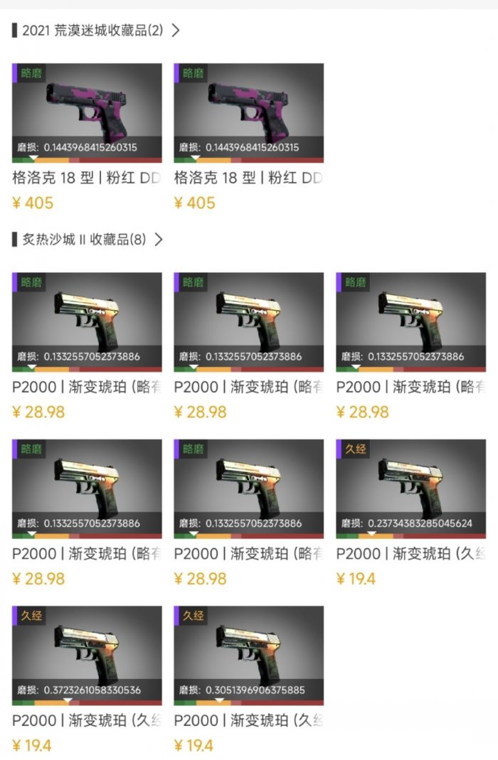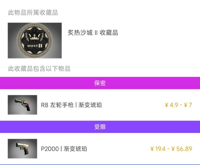 可以注意到 沙二材料渐变琥珀的粉上级只有一个,这也就是我们常说的辅料,通常我们加入较便宜且少上级的辅料来提升主料的磨损与出货概率(有关磨损的内容我们放到下节课讲)