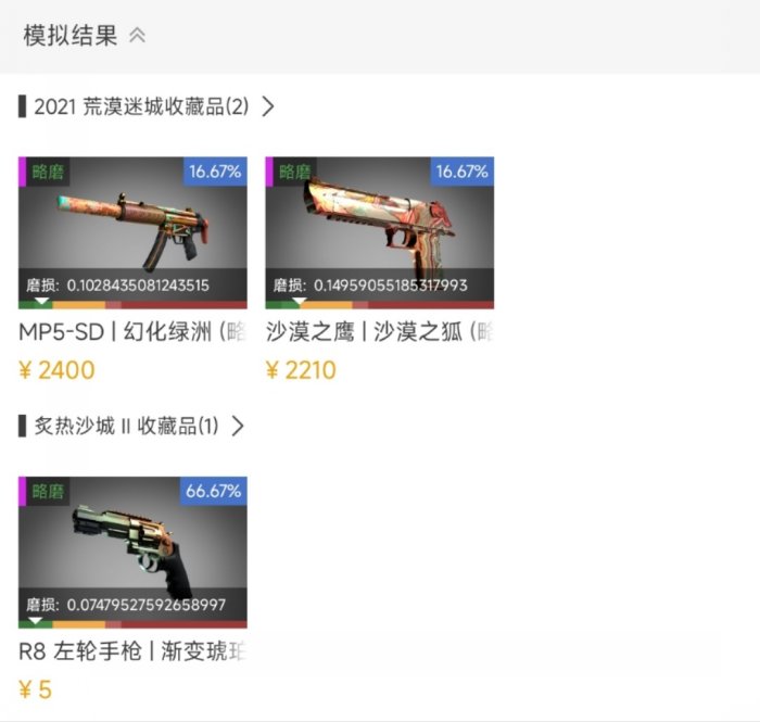 此时摇号箱内共有十二颗小球,摇出我们目标的mirage产物的概率为4/12 也就是33.33%,其中沙鹰与mp5各1/6 也就是16.67%,再回到buff发现模拟结果与我们的计算结果一致。