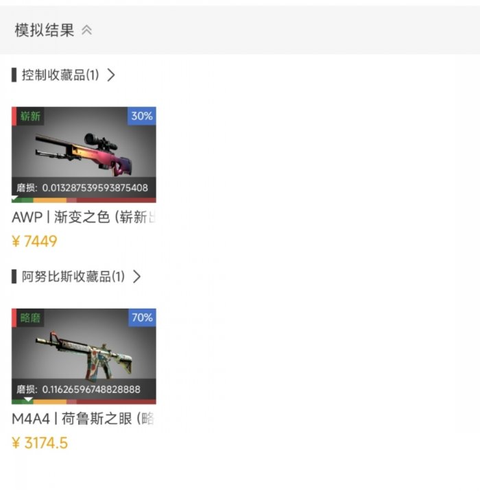 他们各有一个红上级,我们使用三把控制收藏品和七把阿努比斯收藏品的受限级饰品作为材料,先将三颗代表控制收藏品上级渐变awp的小球放入摇号箱中,再将七颗代表阿努比斯收藏品上级荷鲁斯的小球放入摇号箱中,此时摇号箱中一共有十颗小球,摇出代表渐变大狙的三颗小球的概率为3/10 也就是30%,摇出代表荷鲁斯的七颗小球的概率为7/10 也就是70%,进入buff的模拟可以看到,buff给出的概率和我们的计算是一致的。