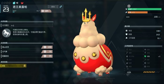 本身白值拉胯,依靠120的HP个体值和BOSS生命值加成倒是前期非常不错的肉盾帕鲁。除此之外真的是一无是处,体积巨大并且移速极为缓慢。