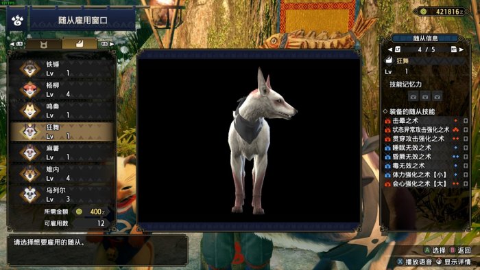 在选购随从时,建议选择天生携带“状态异常攻击强化之术”的随从,在随从等级达到20级即可在随从看板换上此技能,配合麻痹属性武器打点麻痹,这个顺其自然就好。