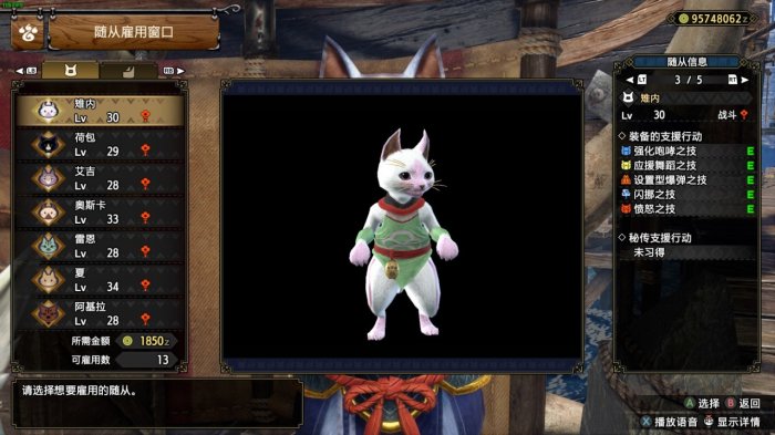 在招募完潜水艇和随从隐秘队的随从后,我们应该选择一些随从用来跟随我们完成任务。日常的开荒狩猎和野外采集建议选择狗+采集猫,在刷特定怪物素材选择两只采集猫,在遇到不易战胜的怪物选择两只治疗猫。联机时需要跑图就选狗,缺素材就采集猫,求生存治疗猫。