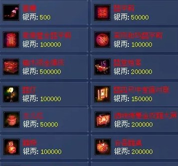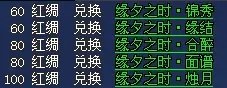 缘夕之时·锦秀、缘夕之时·缘结、缘夕之时·合醉、缘夕之时·面谱、缘夕之时·烛月,NPC婚礼小厮(念湖 215,259)投壶获取红绸兑换,概率获得成品,1次投壶=100元宝