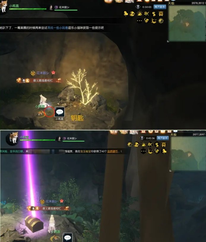 跟随小猫到2078.2012捡钥匙,再喂刚捡的草给小猫,跟随他到2077.2097开宝箱(跳舞那里速度太快,可以只按单个字母,蹲几次就行)
