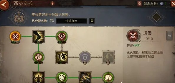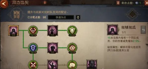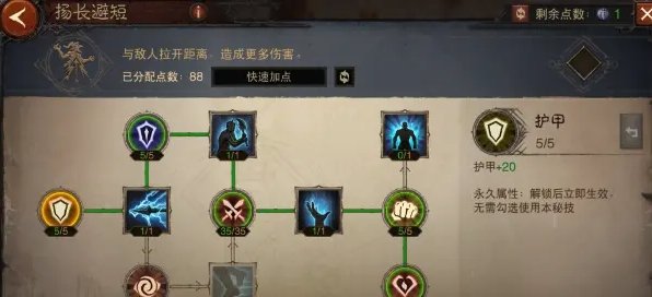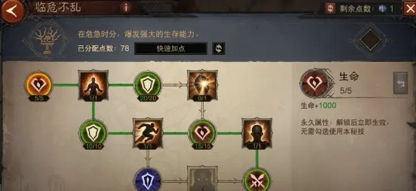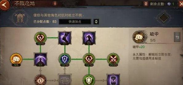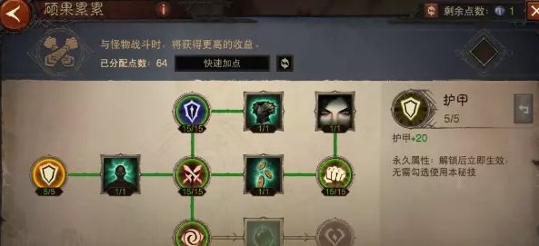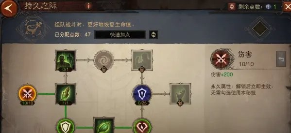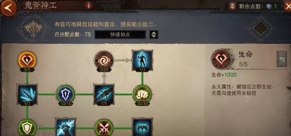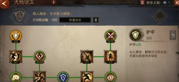 点出这套万金油加点,我们可以激活硕果累累、不败之地、大地守卫、鬼斧神工4个天赋树切换,其中不败之地的【生机】和鬼斧神工的【超凡】是多花了点数的,如果你用使魔的救星可以不点不败之地的【生机】在战歌激活大地守卫天赋,鬼斧神工的【超凡】个人觉得还是必点的,不管是打魔神还是挑战秘境鬼斧神工叠暴击和攻击的能力是非常强势的。