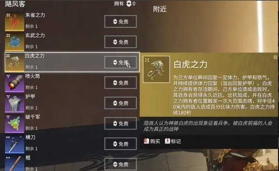 白虎之力能为己方单位瞬间回复一定体力、护甲和怒气,持续时间内提供体力回复,白虎之力持续180秒