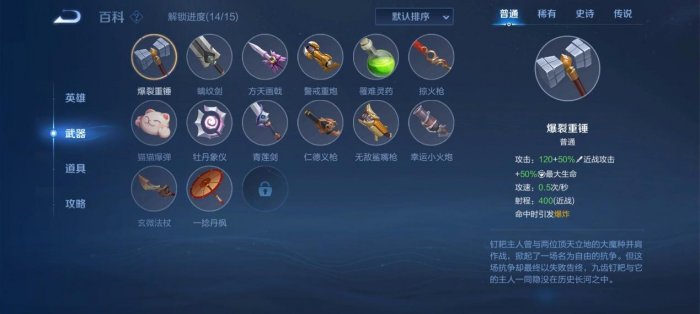 每个人可以同时拥有六个武器,两个同颜色等级的武器可以升级成下一个颜色等级,等级由低到高是:白色,蓝色,紫色,顶级。升到顶级的武器会有一个特殊技能。武器建议大家一个英雄就用一个,不要搭配很多种武器,一般每一个英雄都有最适合自己的一个武器,只用这一个就可以了。