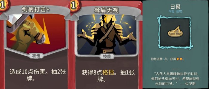 2.打出剑柄打击+,使得耸肩无视重回手牌堆,并且触发日晷特性