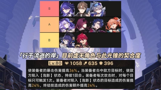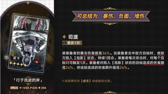 而虚无角色基本可以划分为3种类别,持续伤害输出、向敌人施加各种增益型负面、技能直伤输出。由此我们可以发现,「行于流逝的岸」适合‘持续伤害输出’与‘技能直伤输出’,尤其是后者,更能够将暴击伤害提升最大化。