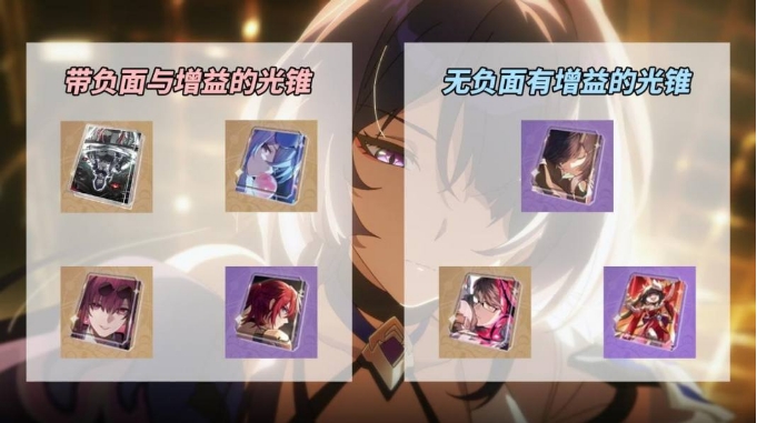 【无负面但有其他增益】4星「晚安与睡颜(佩拉)」72%增伤;5星「以世界之名(瓦尔特)」24%增伤、24%战技攻击力;4星「好戏开演(花火)」30%增伤。