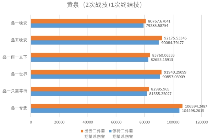 虽然二者差距不大,不过当我们按“3次战技+1次终结技”循环来算的话,提升幅度又会高1%,来到2%~3%。这意味着黄泉大招释放频率越快,停转的收益就越高,反之则出云套的收益越高。