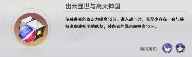 二件套效果是攻击力提高12%。进入战斗时,若至少存在一名与装备者相同命途的队友,则装备者的暴击率提高12%。