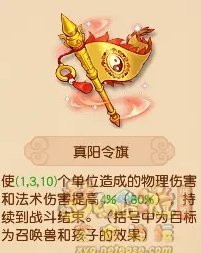 特色:门派灵宝“真阳令旗”可以给队友或召唤兽提供伤害加成,适用于所有阵容。