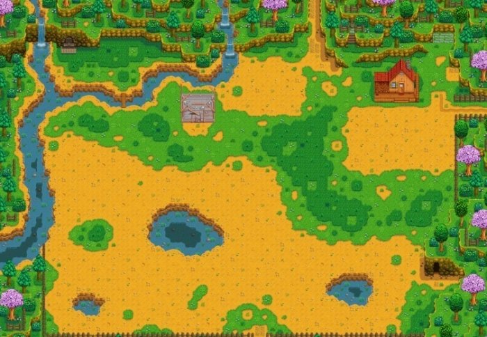 草原农场地图上可耕种的土壤最大一部分位于地图的左下角,但即使这样也有很多不能用于种植农作物的土地、以及很多的池塘和水源。这可能会让你在游戏开始的阶段不会那么的缺水,但如果你希望在夏天可以通过销售蓝莓而致富的话,可能这在草原农场有点困难。
