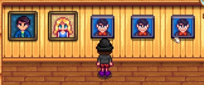 当你和你的配偶好感度有14颗心的时候,可以购买他们的人物挂像,另外还可以购买莫里斯的肖像