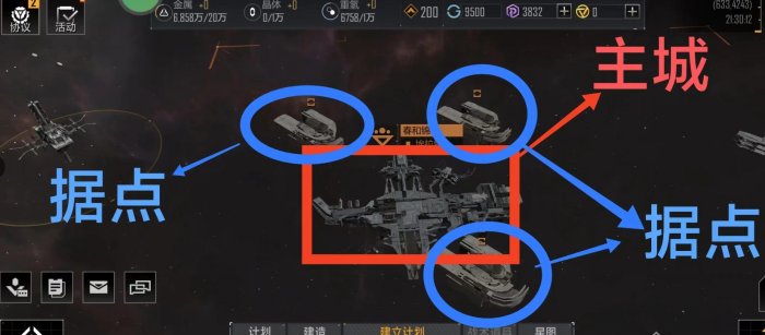 城池即空间站,空间站的等级越高城防舰队的等级也就也高,相对实力也就越强悍,所需攻城人员也就越多,其次每个空间站都可以划分为一个主城与诺干个据点,高于三级的空间站则划分为一个主城,诺干个子城与诺干个据点,且每个城池都有城防舰队,当该城池遭受到攻击开始就会开始刷新城防舰队重置倒计时,当刷新时间归零后,即使该空间站城防舰队已经被全部击败也会重置重新刷新出城防舰队,相当于在一定时间内没有拿下城池就得打两遍甚至三遍城防舰队,具体点击主城可查看(具体如图一画圈处)仅在城防舰队被触发后才可查看刷新时间