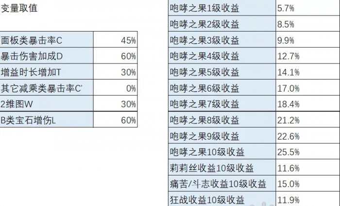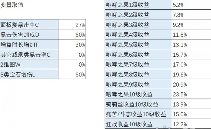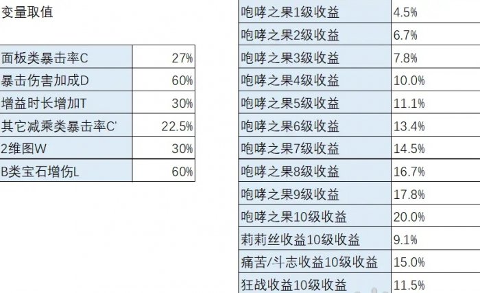 看一下变量,影响咆哮之果收益的变量比较多,先是和莉莉丝一样的当前的面板暴击率C,暴击伤害加成(包含破甲)D,增益时长增加T,以及是否有其它减乘类暴击率C’。然后咆哮之果还可以受到2维图W的加成。为了对比狂战士还要加入B类宝石增伤L。最后因为想对比各等级咆哮之果的效果,将咆哮之果提供的暴击率定为P。