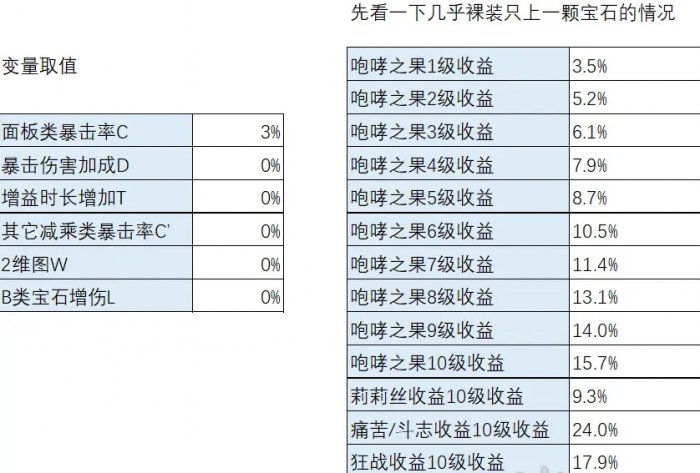 因为引路鬼为减乘类暴击,对新五星算是最不利的情况了,结果也是可见大幅拉低了新五星的收益,但在即使如此不利的情况下,咆哮之果收益依然高于其它宝石。PVE的收益就分析到这里。