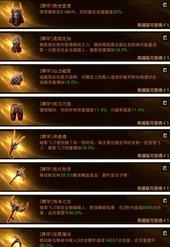 词条选择推射增伤和暗影飞刀增加数量,搭配新主手死亡附录精华强化后的推射流猎魔人在PVE的伤害更上一层楼。其他词条对于PVE猎魔人没有什么明显提高,不推荐使用。