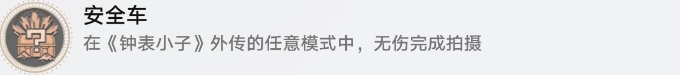 安全车是《钟表小子》外传的解密相关成就,需要在《钟表小子》外传任意模式中无伤完成拍摄,成就位于【众秘探奇】。