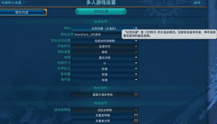 《红死风暴》是大逃杀类游戏最火的时候,文明6跟风出的大逃杀模式。位置在多人模式-互联网-创建游戏-规则-下拉菜单倒数第二个。局域网和热座模式同理。但反正我们还是可以单人游玩,敌人设为电脑即可。
