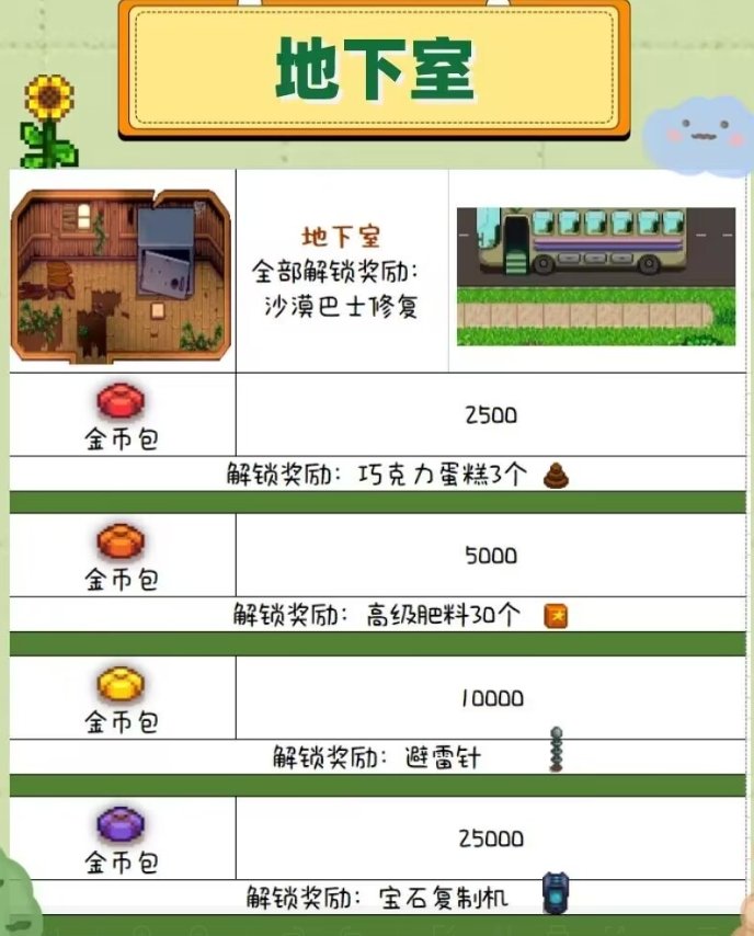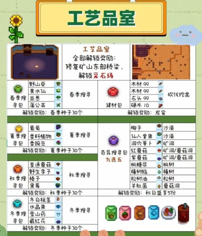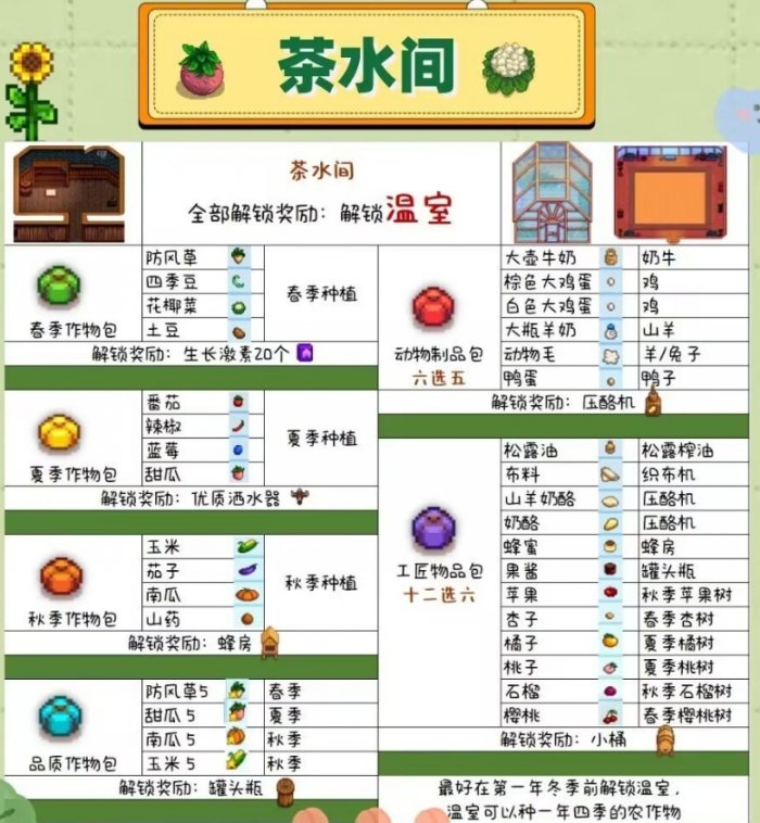 2、茶水间:建议在第一年的冬天解锁,这样可以使用温室,温室不限制季节,可以种所有的农作物,可以保证冬天的收入,所以要留意茶水间所有的收集包内容,一部分可以在猪车买到。