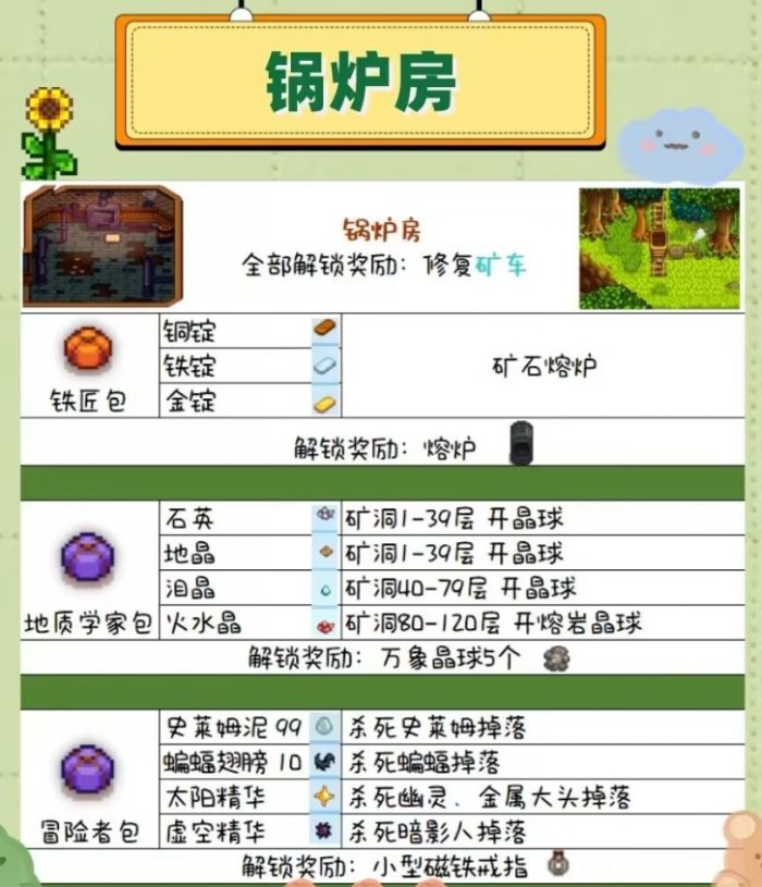 1、锅炉房:锅炉房的收集包较少,也没有季节限制,多下矿即可,比较容易解锁,而且解锁后可以直达矿洞(矿洞首层),城镇(铁匠旁边),巴士站(家旁边),采石场,省了非常多走路的时间,推荐第一个解锁。