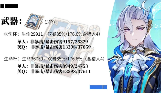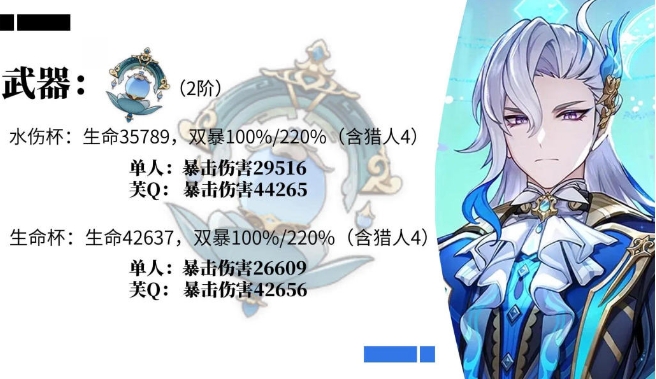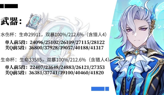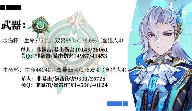 (2)在上述属性下,那维莱特使用【碧落之珑】这类40%以上生命值加成的武器,水伤杯输出略高于生命杯。