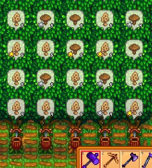 在橡木里面放树桩,每个树桩基本都能产五个,平均每三个就是两个羊肚菌一个普通蘑菇,因为烘干什么星烘干都一样,所以一开始耕种没十级金星的直接卖就可以,铱星的都直接卖,普通的和银星的烘干,也就是(40+150×2)÷3×5×2.1=1190每个树桩每次收就能获得1190的收益,大家搞100个树桩还是很简单的,每4天就有12w收入,而且不用像酿酒那样,还要种地收菜,放进去酿造,再收,所以说这个蘑菇流还是很不错的。