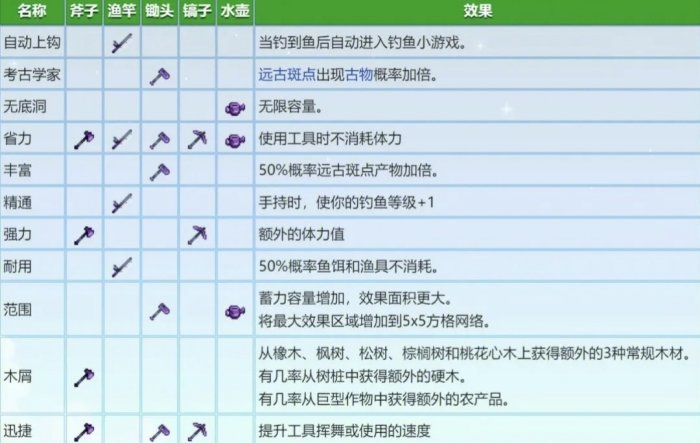 我们可以在锻造台花一个五彩碎片和20个火山晶石,对武器和镐子,斧头,锄头,喷壶和鱼竿进行附魔。