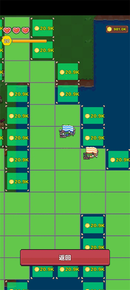 4、每块地放一个浇水器(先放浇水器然后把地挪过去保证浇水器在3*3地的中心)。