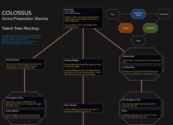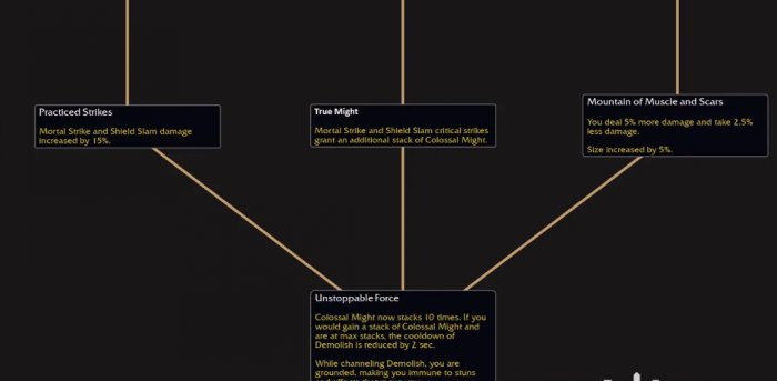 巨像之力:致死打击和盾牌猛击会使你获得一层巨像之力。每层巨像之力会使毁灭的伤害提高10%,最多可叠加5层。毁灭会消耗巨像之力。