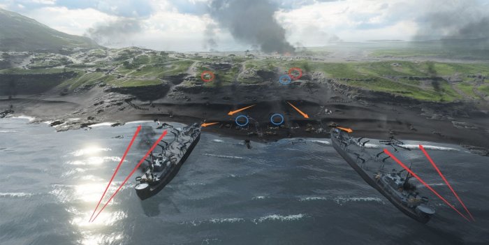 滩头可以说是整个硫磺岛最白给的点位,进攻方的登陆艇和LVT从两边登陆,然后往中间一夹这个点就掉了,需要注意的是红圈的十式炮和蓝圈的六磅炮。登陆艇和LVT走两边六磅炮和十式就打不上了,千万不要走中间。(你也不希望被十式和六磅炮轮番招呼吧)