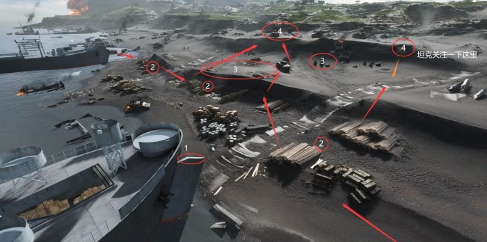 滩头的敌人大概率会分布在下图中红圈的位置,其中滩头最前方(2区)与滩头最后方(4区)的敌人应该是最多的。图中1区是运输船下来的那个门的上边,那个地方是可以趴的,很有可能藏个大机枪或是别的什么脏东西,登陆时记得先看一下这里有没有藏人。2区为滩头最前面的掩体部分,这里大概率也会藏着一些敌军。3区地势平缓,可用的掩体不多,一般不会分布非常多的敌军,打2区的时候可用顺带把3区的人清掉,如果人比较多,步兵站不住的话就封几个烟缓一缓再往上走。3区还分布着不少赛博长城,赛博长城后面也有可能会藏人,记得清。4区为滩头最上方,当敌人被压到4区,整个滩头也基本拿下了。