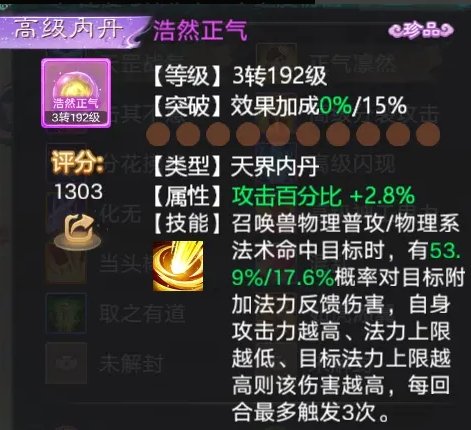 浩然正气:自身攻击力越高、法力上限越低,打出的伤害越高。附法单:与宝宝自身法量有暗度陈仓:增加召唤兽命中、若处于封混睡忘状态,有概率立即解脱并进行一次物理普攻后重新加上控制状态。