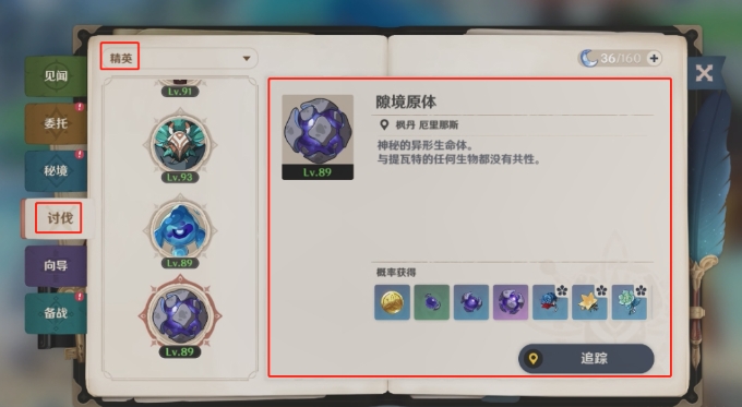 1.打开书籍,在讨伐--精英--隙境原体--追踪