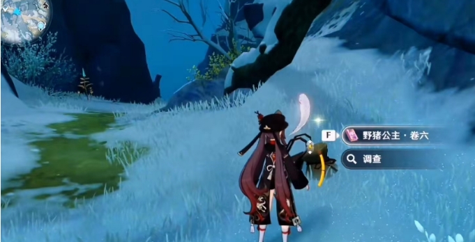 最后一本书籍位置,在完成雪山的前置任务【雪山迷踪】 后,在图中标记处有一个调查点可以拿到《野猪公主·第六卷》