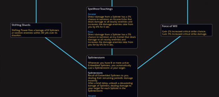 碎片风暴:召回所有嵌入的破片,立即造成它们剩余的周期性伤害。短暂延迟后,释放一阵毁灭性的碎片弹幕,弹幕中的每个碎片都会对你的目标造成伤害。碎片风暴使你获得节能施法(奥术)或对目标施加深冬之寒(冰霜)。