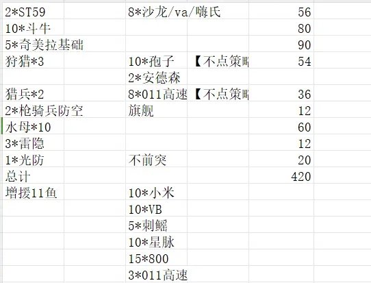 【通用思路】高输出小船补充对舰输出,59+11鱼组成经典空军体系对空以及对舰,前排巡洋+驱护强度可观,即使空战结束,护航艇掉完不至于立刻失去作战能力,依靠自身坦度以及海军输出仍然可以拥有一定的持续作战能力。