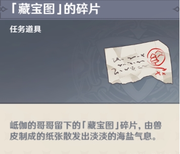 岻伽藏宝图碎片共有四张,这是一个哥哥留给妹妹的藏宝图,需要在鹤观岛上找到4个海螺,拾取海螺后可以获得藏宝图碎片,完成后开启宝箱可以获得30原石。