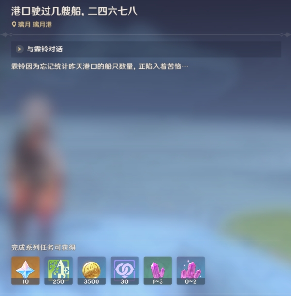 完成这个成就需要在璃月的每日委托里刷到:港口驶过几艘船,二四六七八