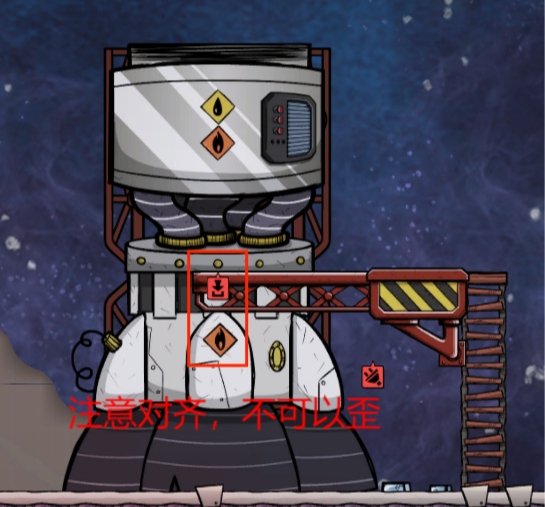 蒸汽引擎自身就是燃料仓,所以没有这一步,直接跳过,另外两个则需要。通过搭梯子小人是没办法建造燃料仓的,此时需要通行支架作为中介。注意龙门架的摆放,末端与引擎上的火焰图标对齐。梯子最好用黑曜石材质,不然后面融化给你看。燃料舱和氧化剂仓都需要放上。